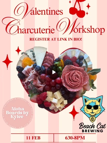 Limited Space Available! This Valentines themed charcuterie class with Aloha Boards at Beach Cat Brewing is sure to be a fun and tasty night!