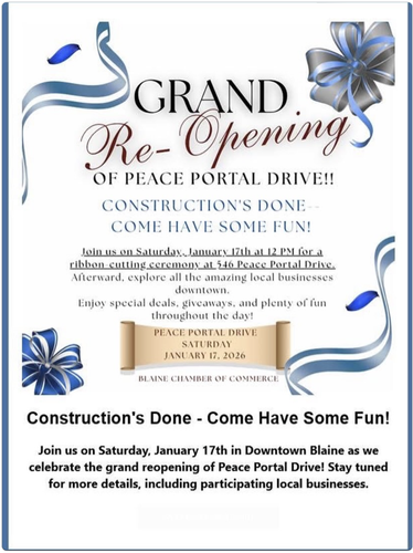 Construction is done in downtown Blaine, Peace Portal Drive! There will be a ribbon-cutting ceremony at noon at 546 Peace Portal Drive. Afterward, explore all of the amazing local businesses downtown! Enjoy special deals, giveaways, and plenty of fun throughout the day!