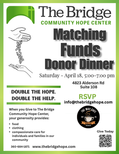 Join The Bridge Community Hope Center for a Matching Funds Donor Dinner on Saturday April 18 from 5pm-7pm. When you give to The Bridge your generosity provides: food, clothing, compassionate care for individuals and families in our community. RSVP at info@thebridgehope.com